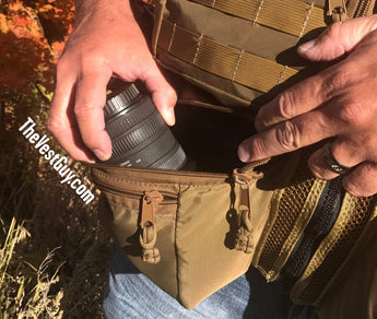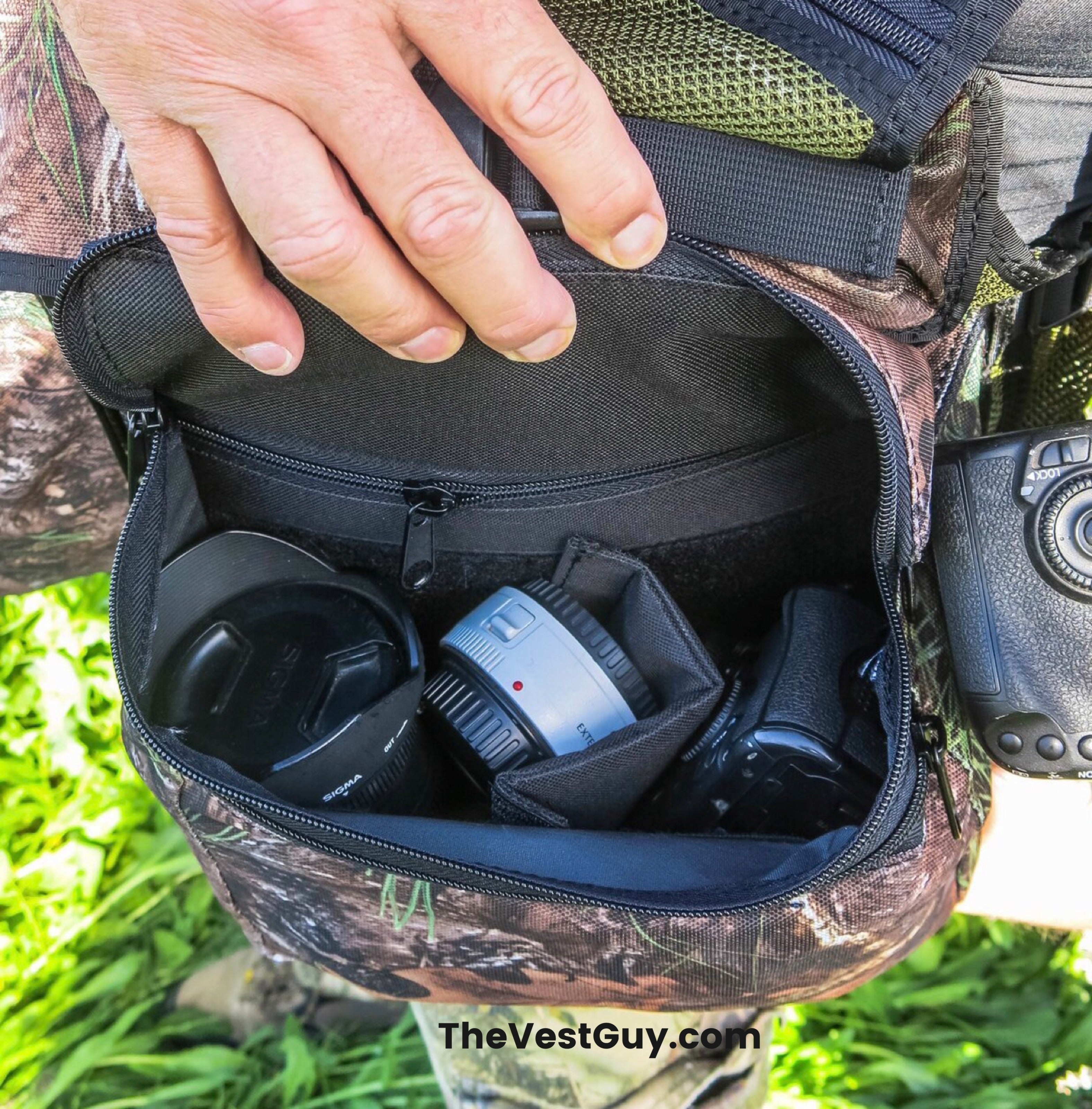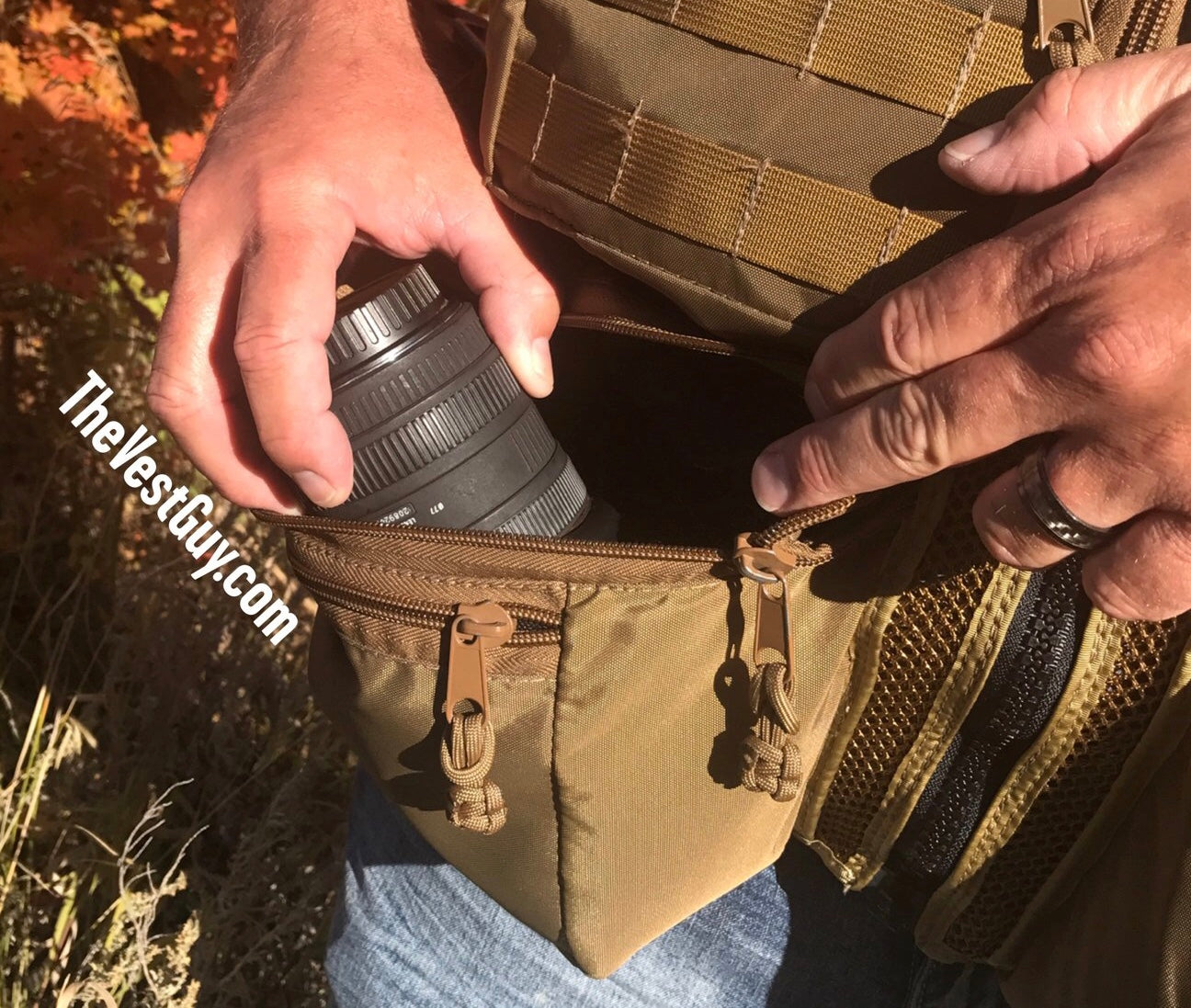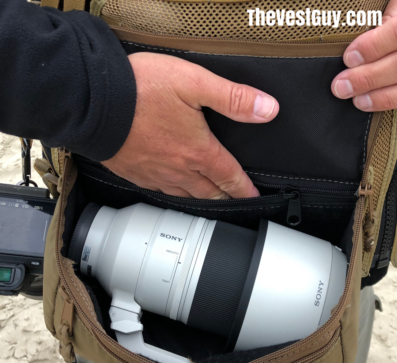 Our MOLLE cargo pocket holds two standard or wide-angle lens. This cargo MOLLE pocket comes standard with inside and outside zipper pockets and one soft sided adjustable pocket divider to protect multiple lens. If you'd prefer to store a 70-200mm or 100-400mm telephoto lens just simply remove the divider and you're good to go.