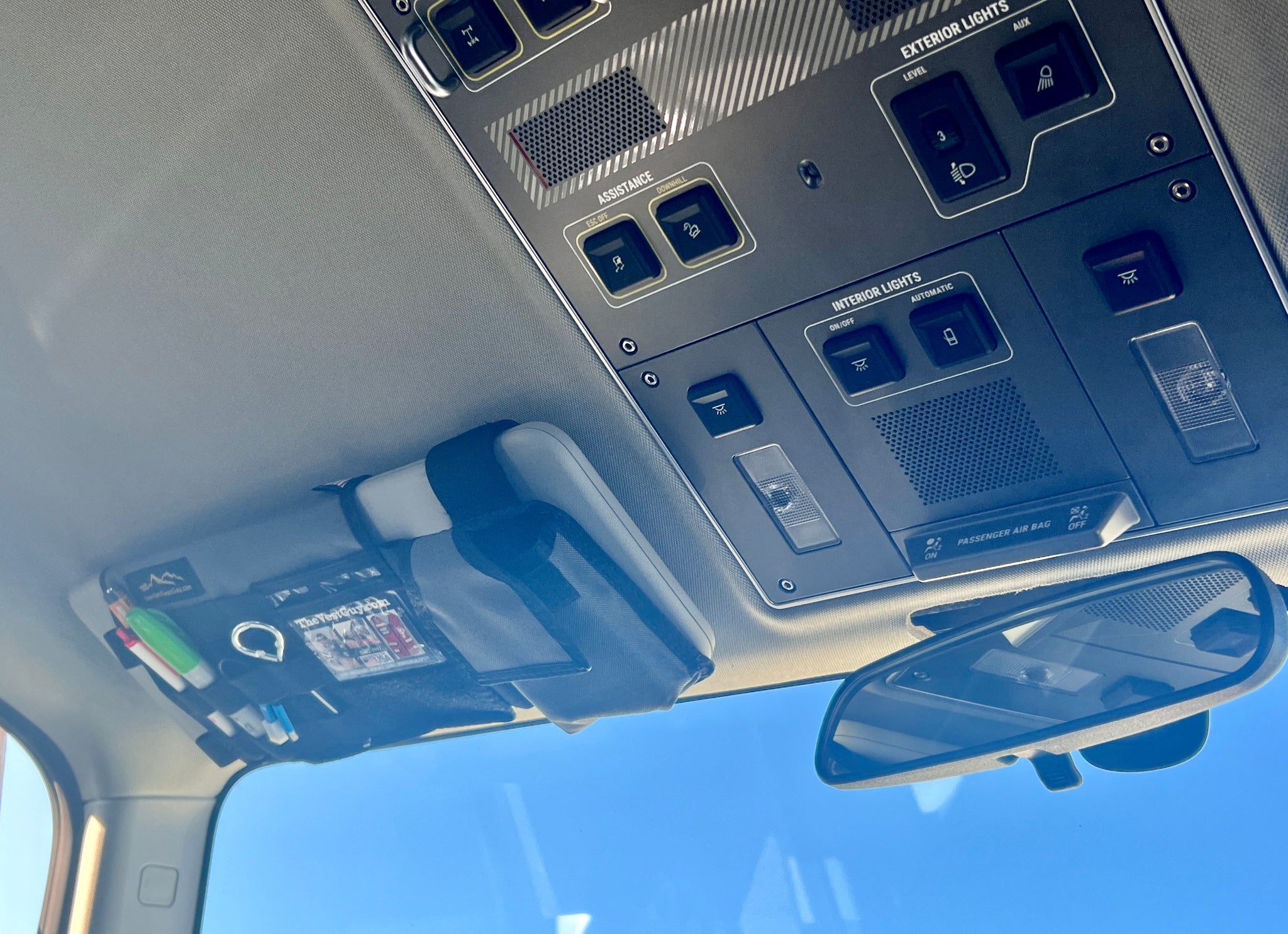 This versatile organizer attaches securely to your sun visor, providing a convenient and accessible location for your essential gear.
