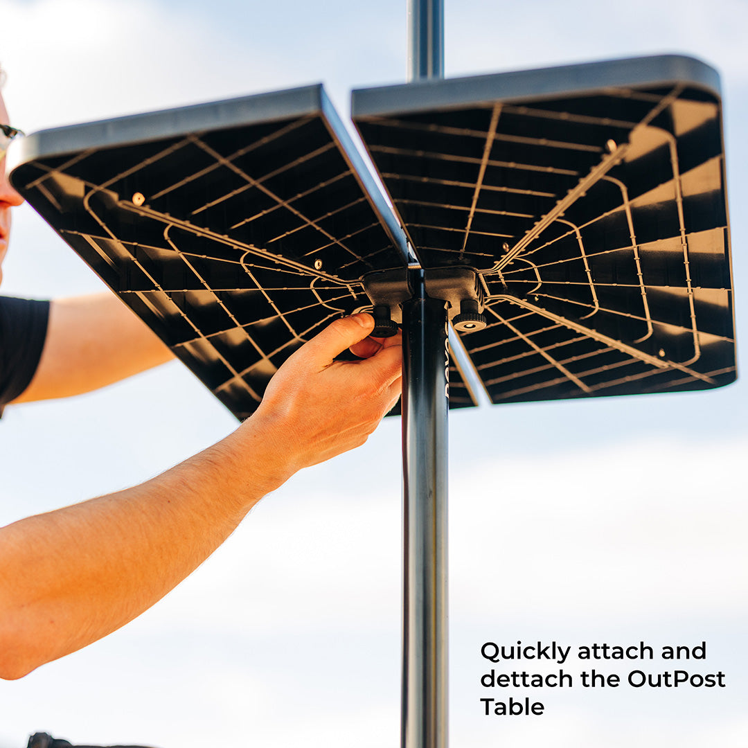 What's Included? The Outpost Table includes (2) 9" x 24" table panels, (2) no-slip molded receivers that bolt onto the 2nd section of a standard LightRanger 800, 1200, 2000, or 4000 telescoping pole, (2) flat head retaining bolts and oversized thumb nuts to keep each table locked into the receiver, and a durable nylon carry bag.